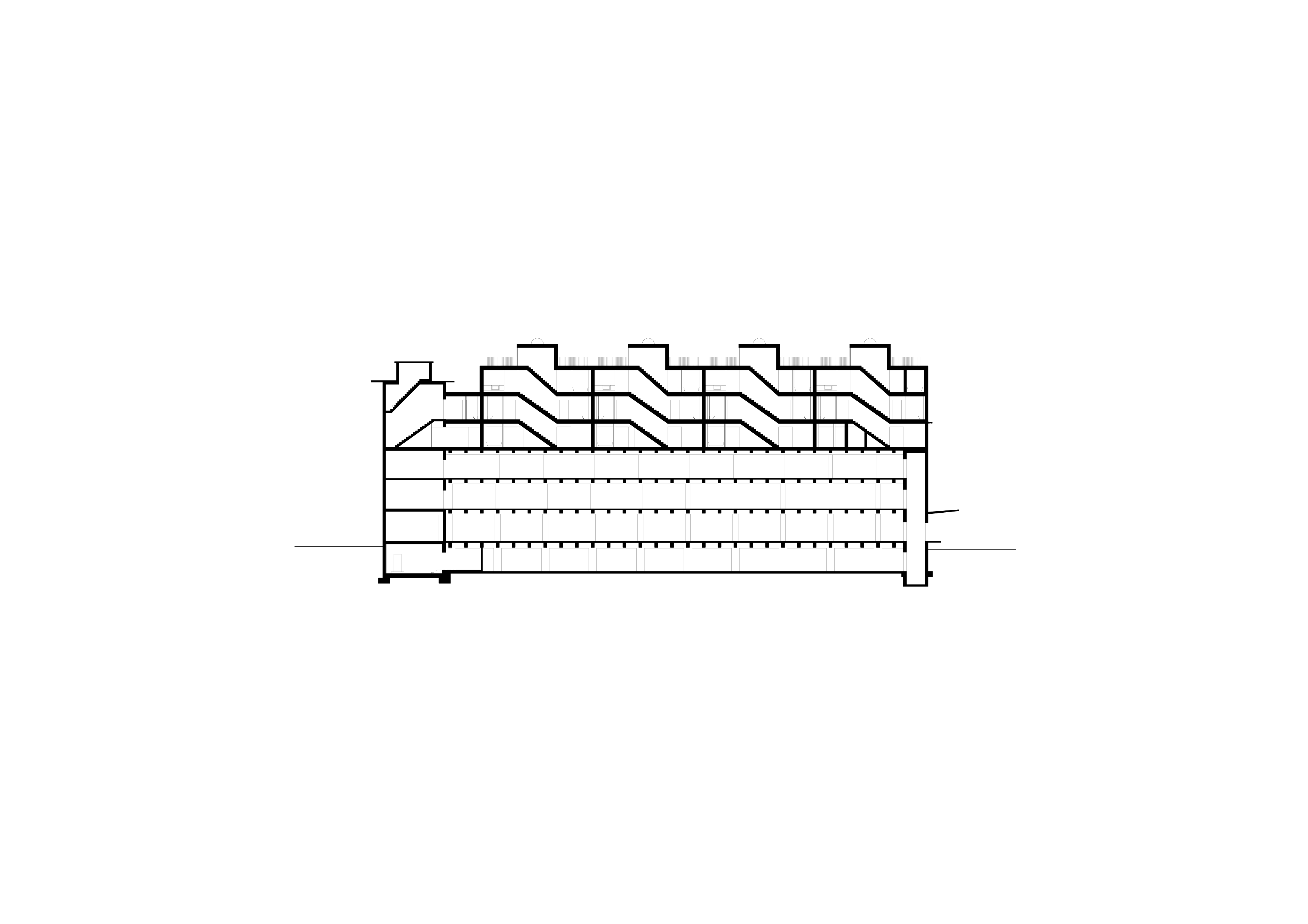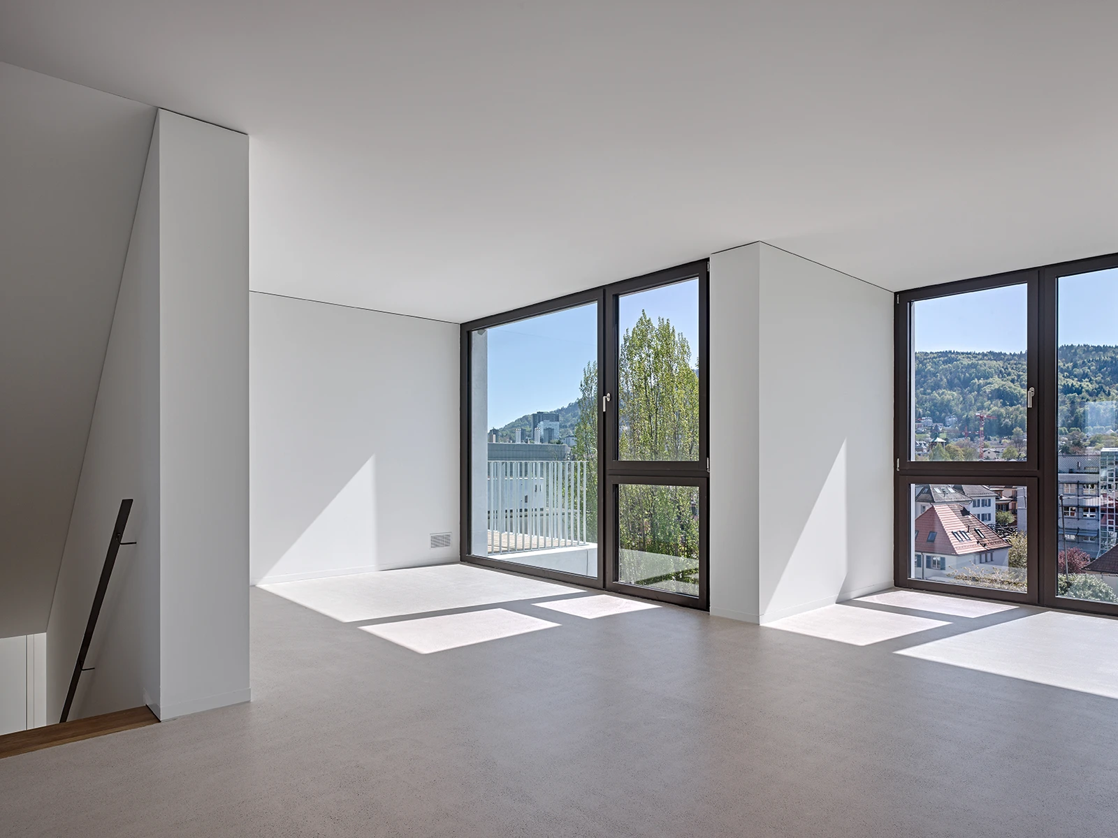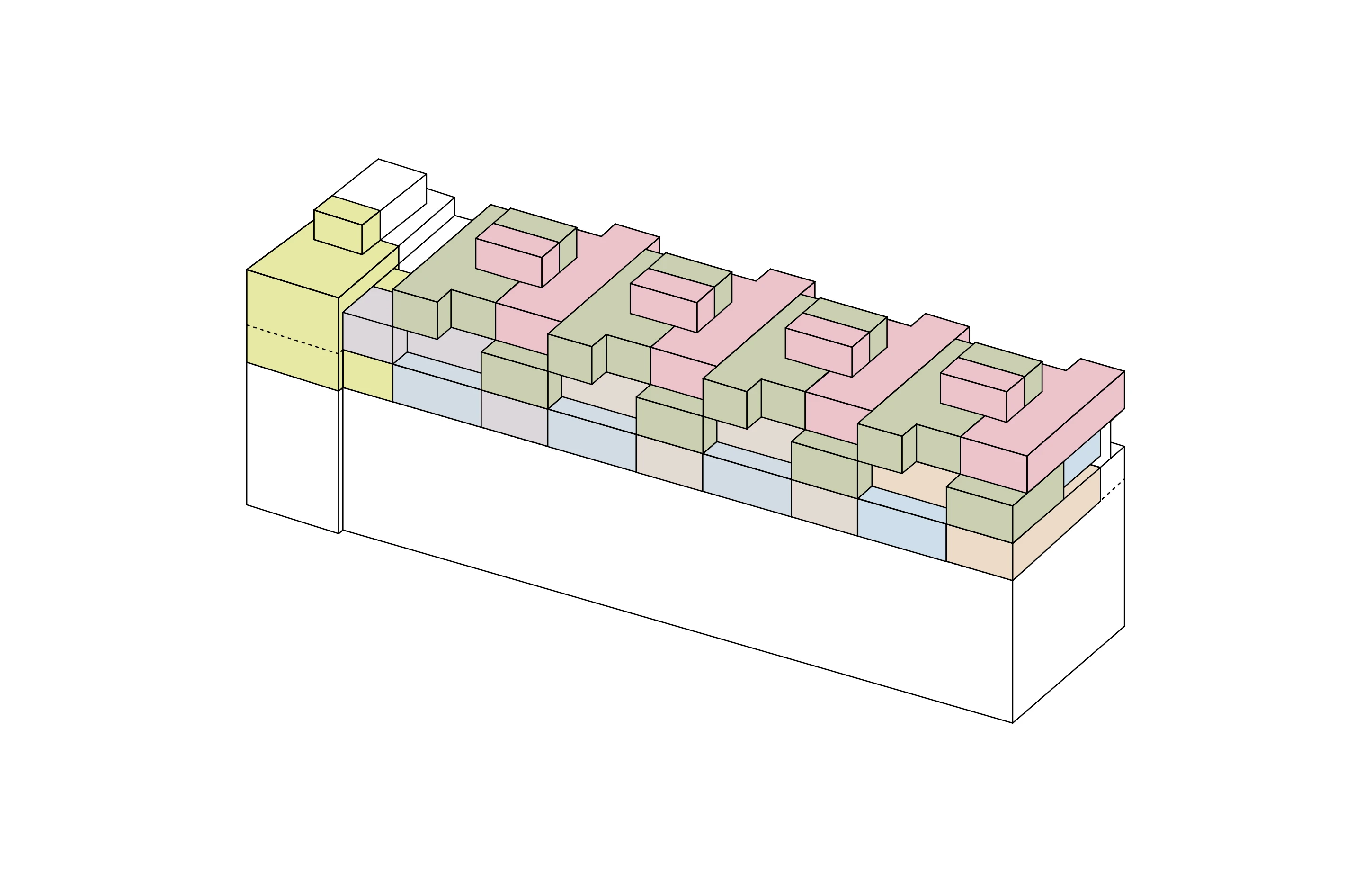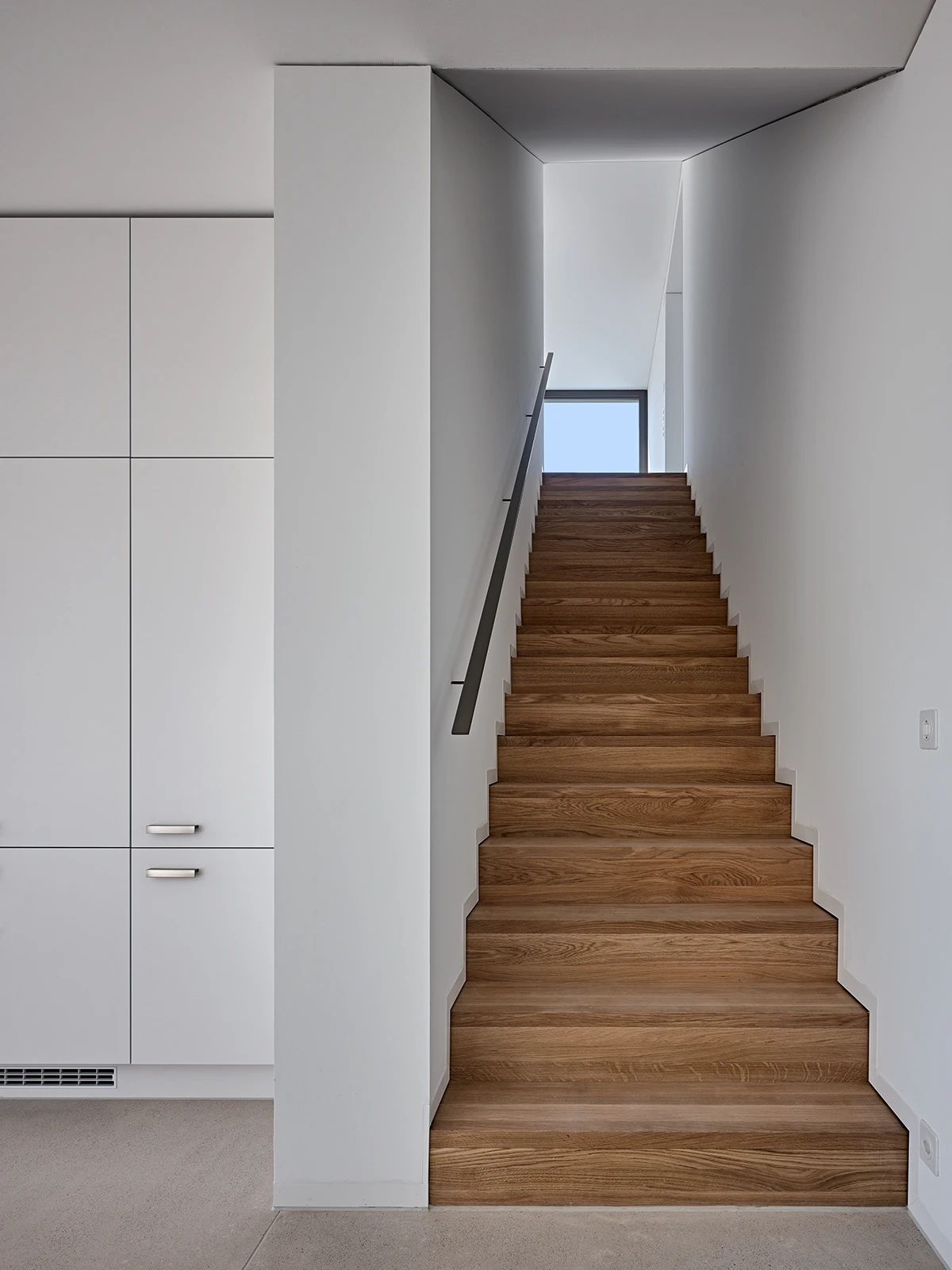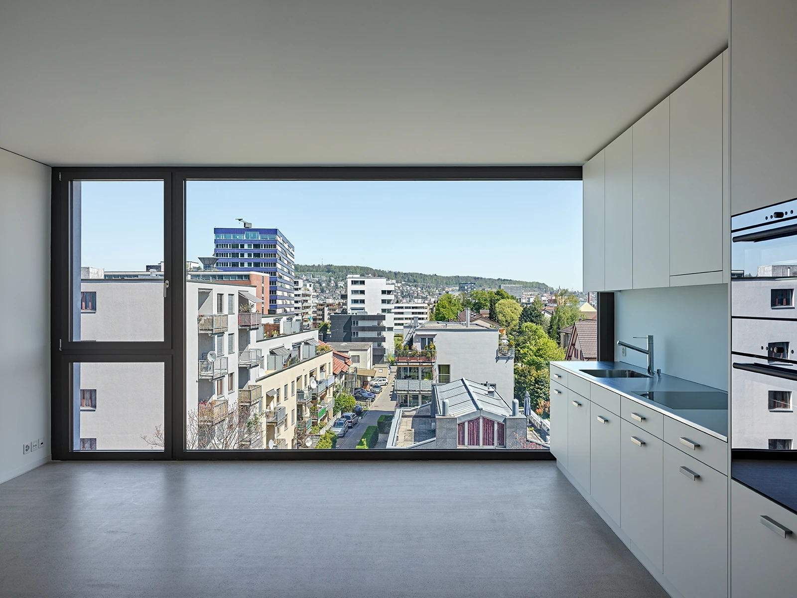 Although the extension’s structure appears simple and clear at first glance, the individual duplex flats are intricately interwoven. In addition to the spatial variation of the two basic types, this also allows the 17 apartments to be orientated towards the building’s calmer rear side. The spacious living and sleeping rooms extend outside as terraces. The unit’s vertical organisation inside offers the spaciousness of a small townhouse: depending on the type of apartment, the internal staircase leads down one storey to the converted building structure on the 3rd floor or up to the new 5th floor. All units are accessed from the 4th floor by a single internal corridor, a rue intérieure, which is illuminated centrally via vertical shafts, referred to as light cannons. The façade appears urban and reflects the extension’s internal organisation. The low-detail cast fibre-cement panels are durable and create a link back to the foundation’s solid structure.