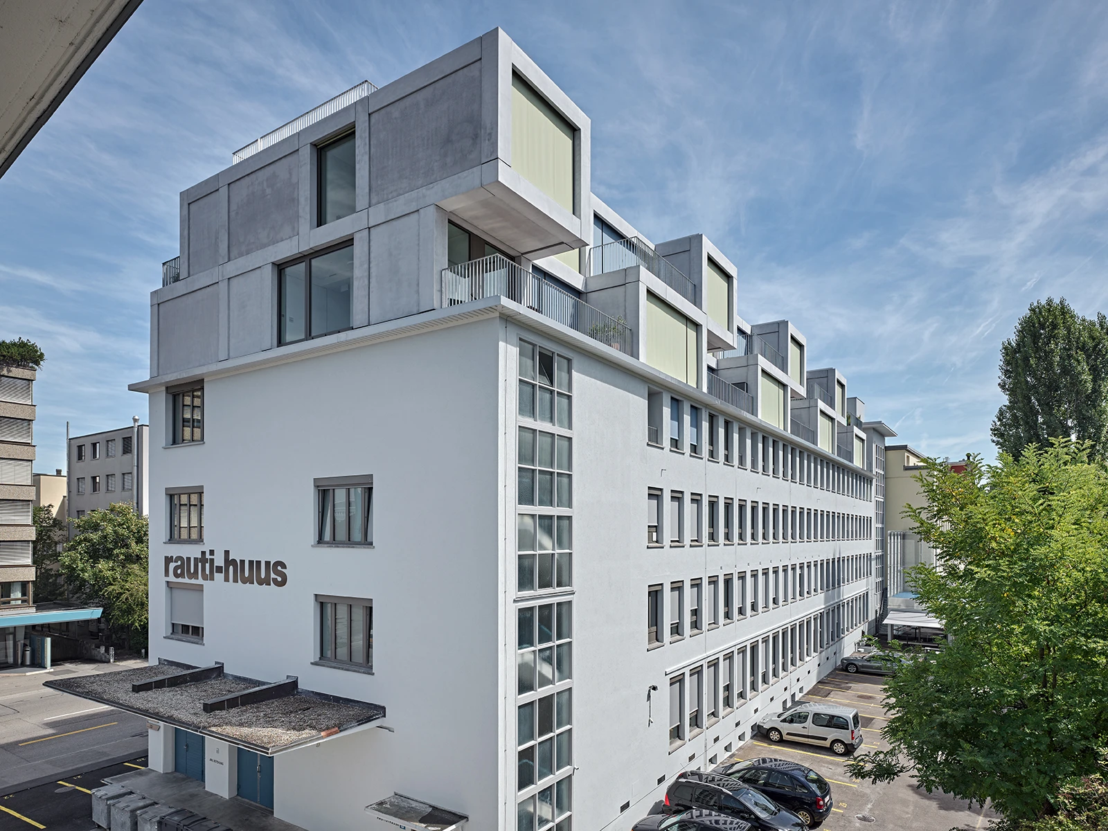 Subsequent additions and extensions were removed and the four-storey concrete frame building was extended with a lightweight timber construction. Now appearing as a six-storey building, this testament to the post-war period is used today as a laboratory and office building on the first three floors. Starting on the third floor, the structure has been converted into new living space.