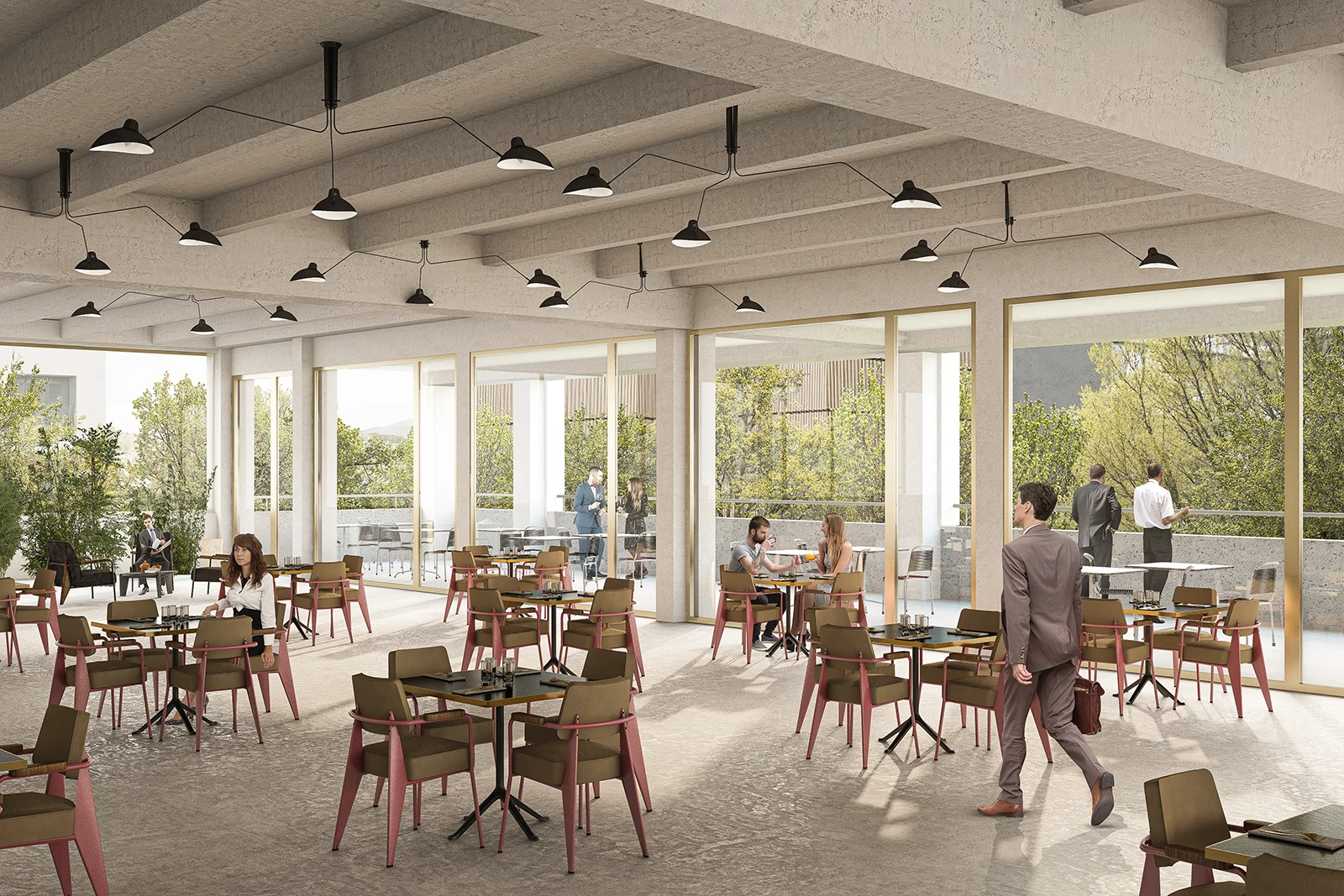 Prefabricated concrete elements are combined with metal window frames to determine the facade’s materiality, while ribbed concrete ceilings and granolithic concrete floors define the interior aesthetics. The granolithic concrete is installed in a composite structure between the courtyards and the cores and is cast into a raised floor system with cable ducts and floor sockets in the office areas. The cores are built with exposed concrete, while smaller meeting rooms are glazed. Finally, the restaurant zones feature high-quality, jointless terrazzo.