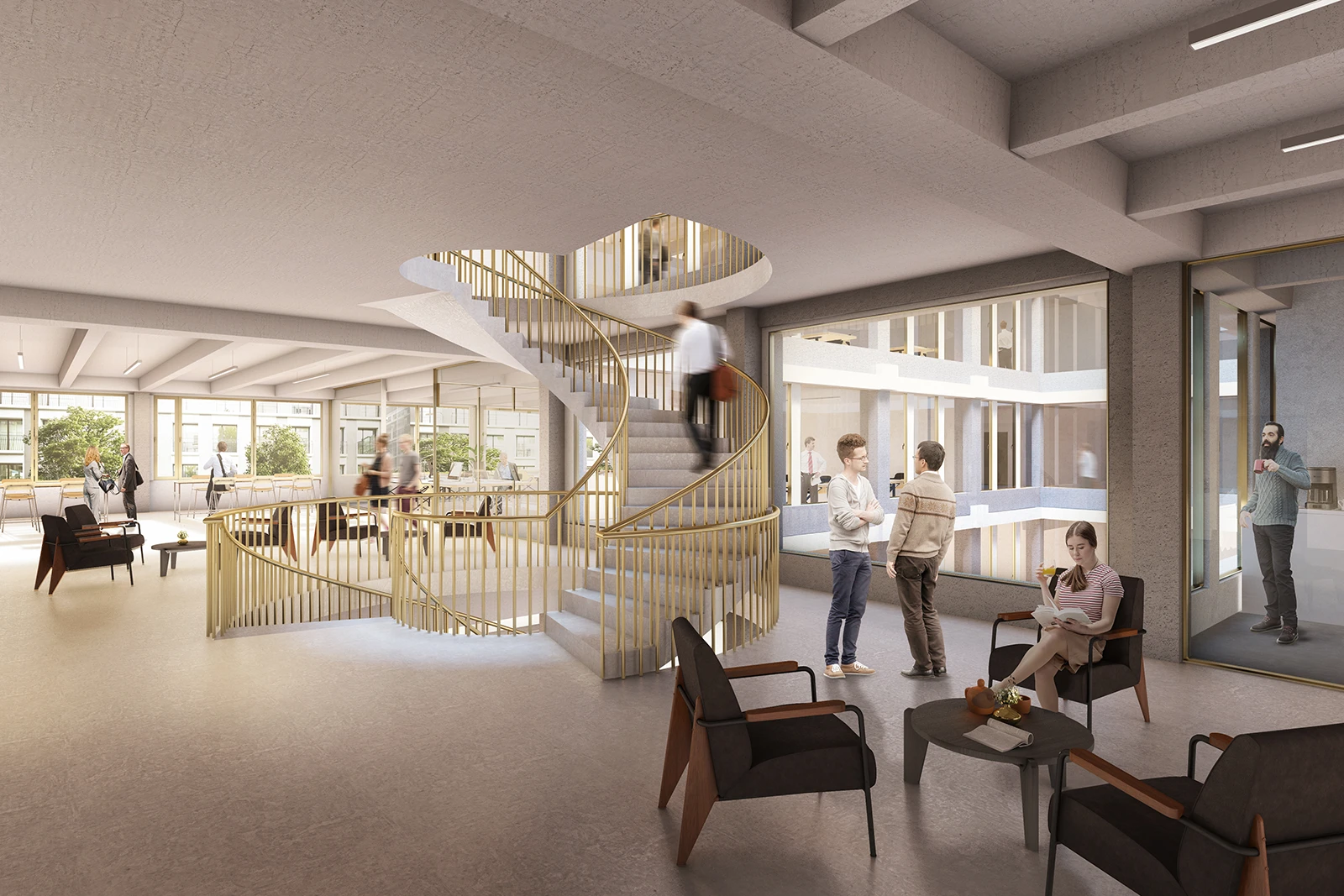 The proposed building comprises a ground floor with high ceilings, a mezzanine, three typical floors, and an attic. Its generously proportioned, tectonically joined, and robust façade with an industrial aesthetic is structured with loggias on its longer side, determining the expression of this visually condensed urban building block. A highly efficient structurally load-bearing system of beams and ribs characterizes the ceilings inside. Centrally arranged, a generous spiral staircase connects the floors, providing attractive views into the courtyard.