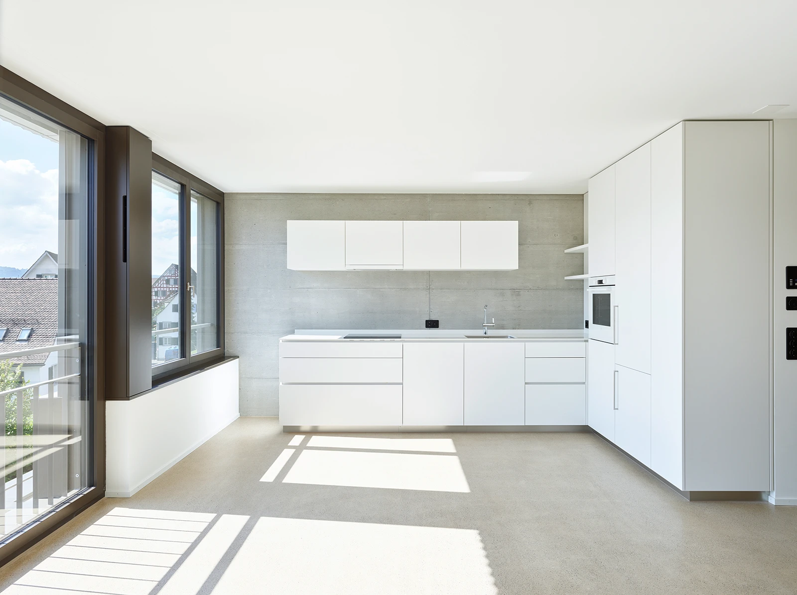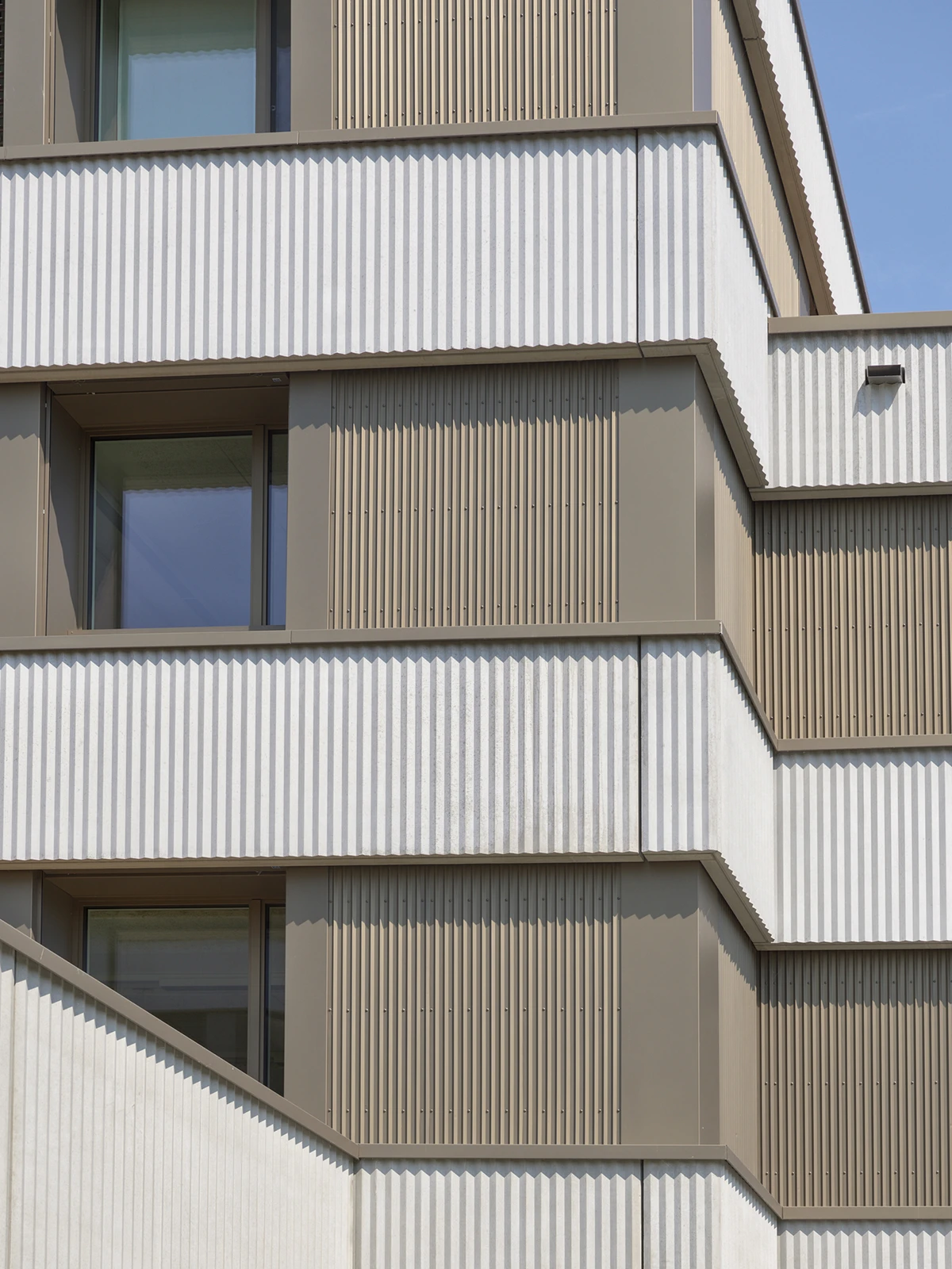 A tectonic façade design visually unifies the structures while allowing each building to retain a subtle individuality. The Bahnhofstrasse-facing commercial building preserved its original façade grid and presented a more restrained aesthetic while complementing the playful design of the new addition. Fenestration is tactically adapted to enhance the interior spatial dynamics and features wall-to-ceiling living room windows interspersed with smaller parapet-framed openings. Both structures exhibit a façade with a rear-ventilated, pre-installed system made of tactile metal panels.