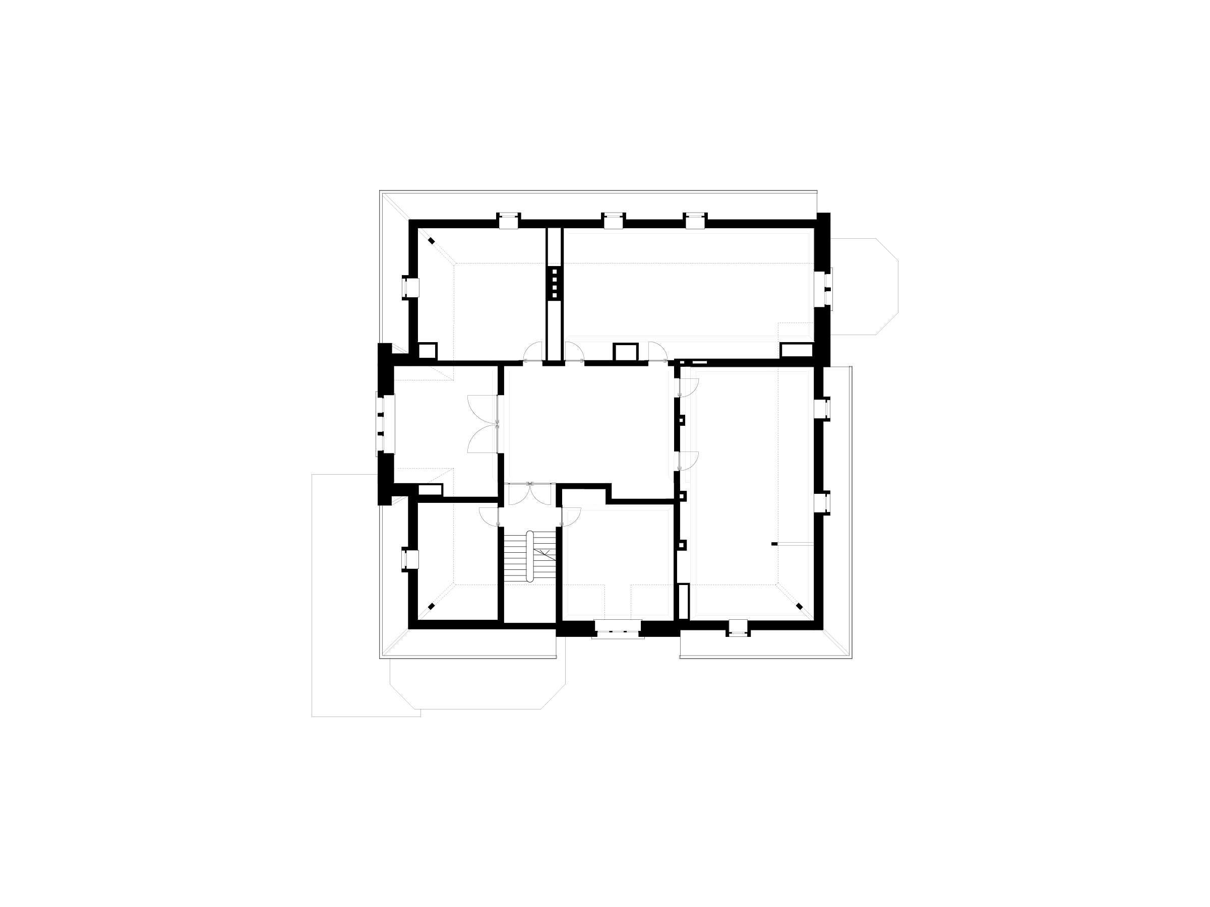 Das erste Obergeschoss folgt ebenfalls dem klassisch organisierten Hauptgeschoss, dessen Raumkammern sich radial um einen Raum in der Mitte schmiegen. Durch eine auf dessen Innenseite angelegte Schrankschicht, die mit kassettiertem Holzwerk ausgebildet ist, werden die umgebenden Räume betreten. Unter dem Zentralwalmdach, das bereits heute eine mittige, zenitale Öffnung aufweist, wird ein vierter, grosszügiger Seminarraum von rund 40 m2 in die Struktur eingeschrieben. Da dieser oberste Raum keinen direkten Sichtbezug zum Park hat, sublimieren sich die ihn umgebenden Baumkronen auf einer textilen Wandbespannung und verwandeln ihn in ein grünes, fast laubenartiges Gartenzimmer. Gleichzeitig stellt diese florale Wandbespannung den Bezug her zu den ursprünglich in der Villa vorhandenen, kunstvoll handbemalten Tapeten von Hans Sandreuter.