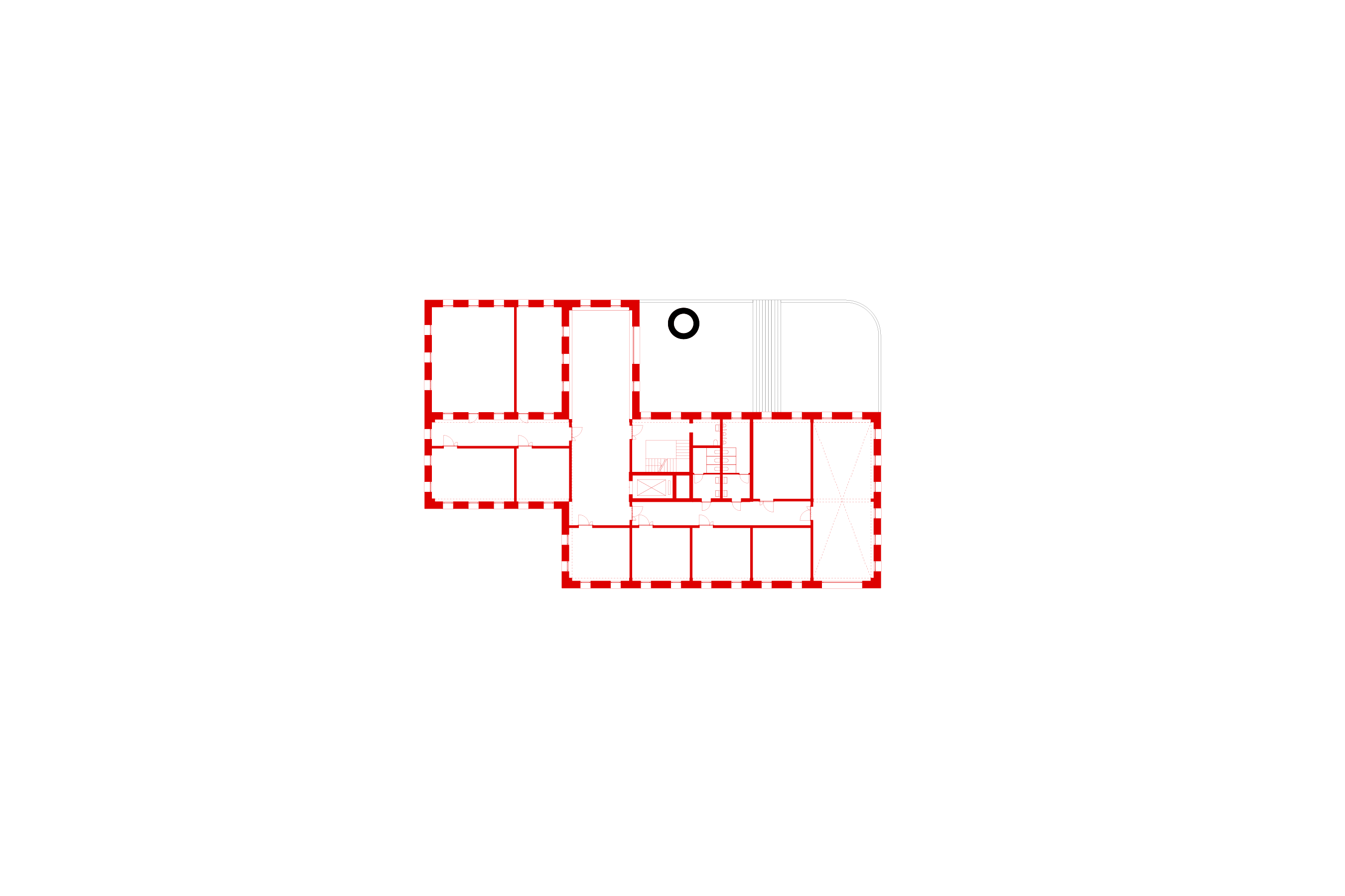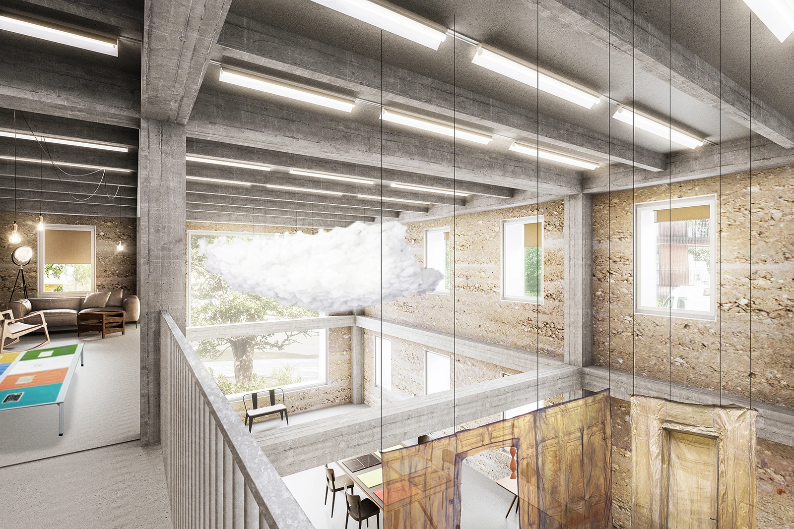 A thick layer of rammed earth encases the flexible structure. Applied in combination with straw, this monolithic, high-quality natural material offers efficient insulation, provides an ideal indoor climate, and minimizes the building’s carbon footprint. The arrangement of perforations in the new façade interrupts the monotony of the conventional window composition found on the existing administration building. Oversized apertures are strategically placed to create a new series of focal points that establish visual connections between the different volumes.