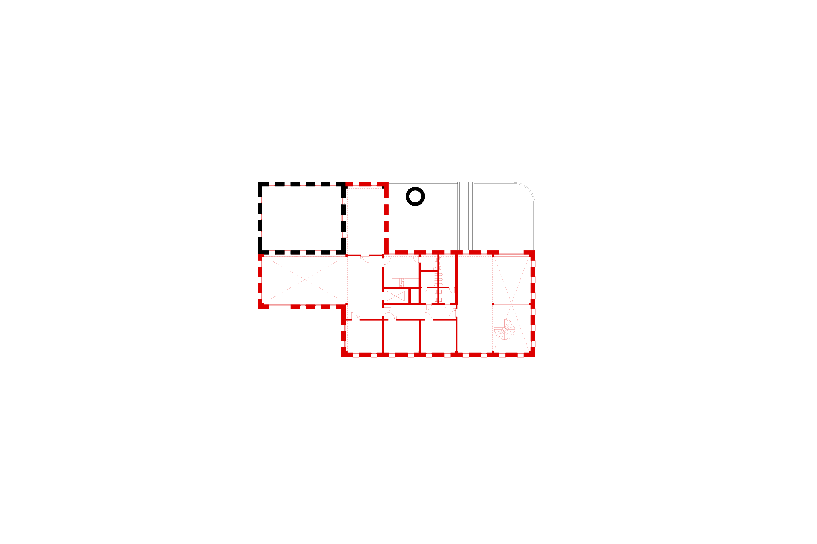 Vehicles can access the building from the southeast, where a delivery yard is set apart from the rest of the grounds by a grove of trees. There, the workshop spaces connect to the street-level yard via large sectional doors that allow for the delivery of goods ranging from small merchandise to large art pieces. All along the western side, the plinth follows the contours of the historical administration building, which is surrounded by and incorporated into the sculptural new building.